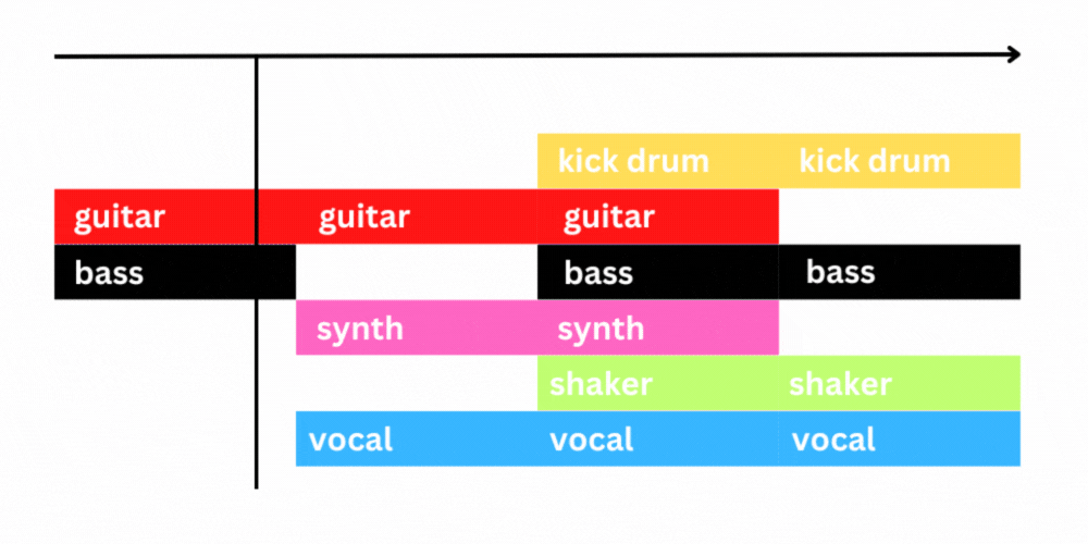 When you play the song back, the play cursor runs from left to right, playing all of these channels (i.e. instruments or parts) at the same time, to create the piece of music that you intended to make.